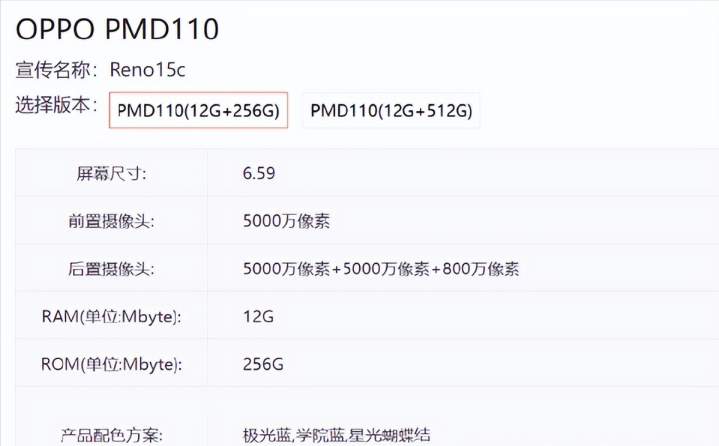 从电信终端库信息来看,Reno15c 的硬件堆料堪称诚意十足:
